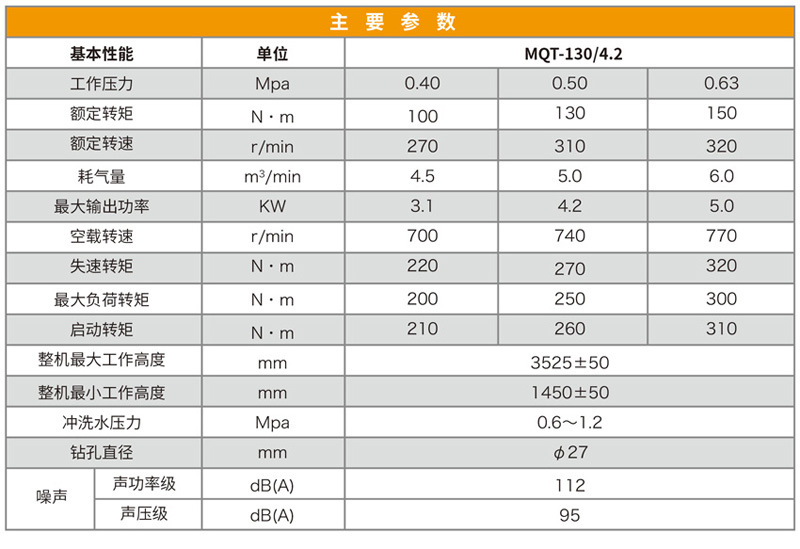 MQT-130/4.2型氣動錨桿鉆機廣泛適用于巖石硬度≤f10的巷道,特別適應煤巷的錨桿支護作業,既可鉆頂板錨桿孔,又可鉆錨索孔,還可攪拌和安裝樹脂藥卷類錨桿、錨索,無需其他設備,既可實現錨桿螺母一次性安裝擰緊,達到初錨預緊力要求。