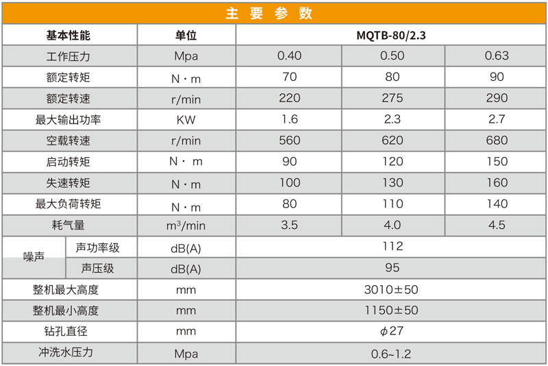 MQTB-80/2.3型氣動支腿式幫錨桿鉆機廣泛適用于巖石硬度≤f8的巷道,特別適應煤巷的錨桿支護作業,既可鉆頂板錨桿孔,又可鉆錨索孔,還可攪拌和安裝樹脂藥卷類錨桿、錨索,無需其他設備,既可實現錨桿螺母一次性安裝擰緊,達到初錨預緊力要求。