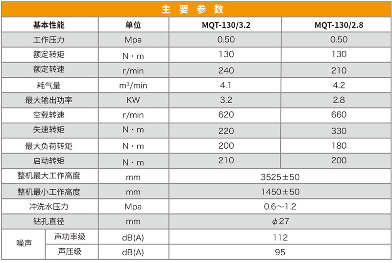 MQT-130/3.2/2.8型氣動錨桿鉆機廣泛適用于巖石硬度≤f8的巷道,特別適應煤巷的錨桿支護作業,既可鉆頂板錨桿孔,又可鉆錨索孔,還可攪拌和安裝樹脂藥卷類錨桿、錨案,無需其他設備,既可實現錨桿螺母一次性安裝擰緊,達到初錨預緊力要求。